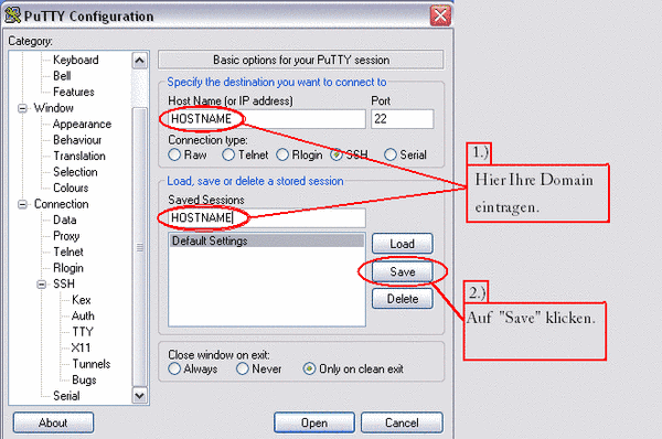 - Speichern Sie unter "Sessions" Ihre Verbindung nochmals ab, da sonst die Tunneleinstellungen beim Beenden von putty verloren gehen.